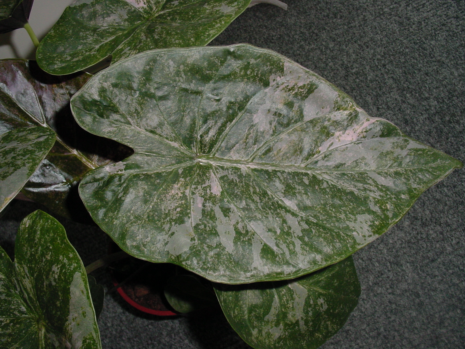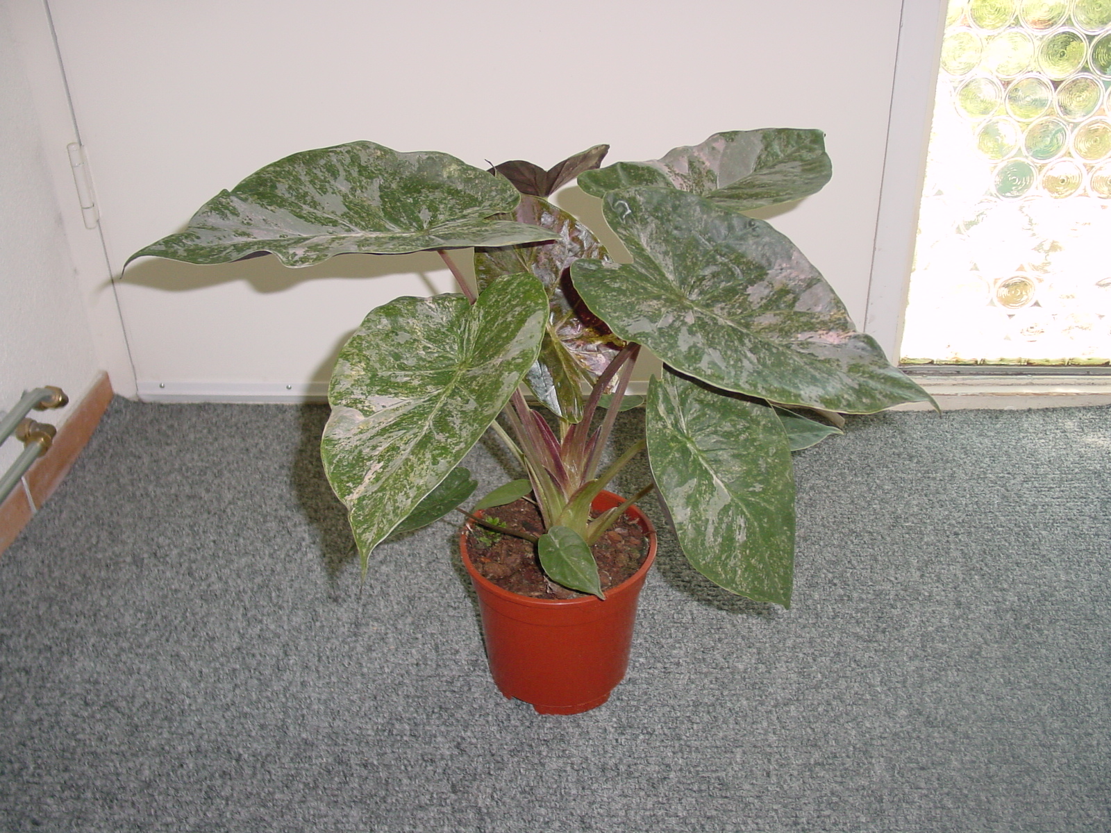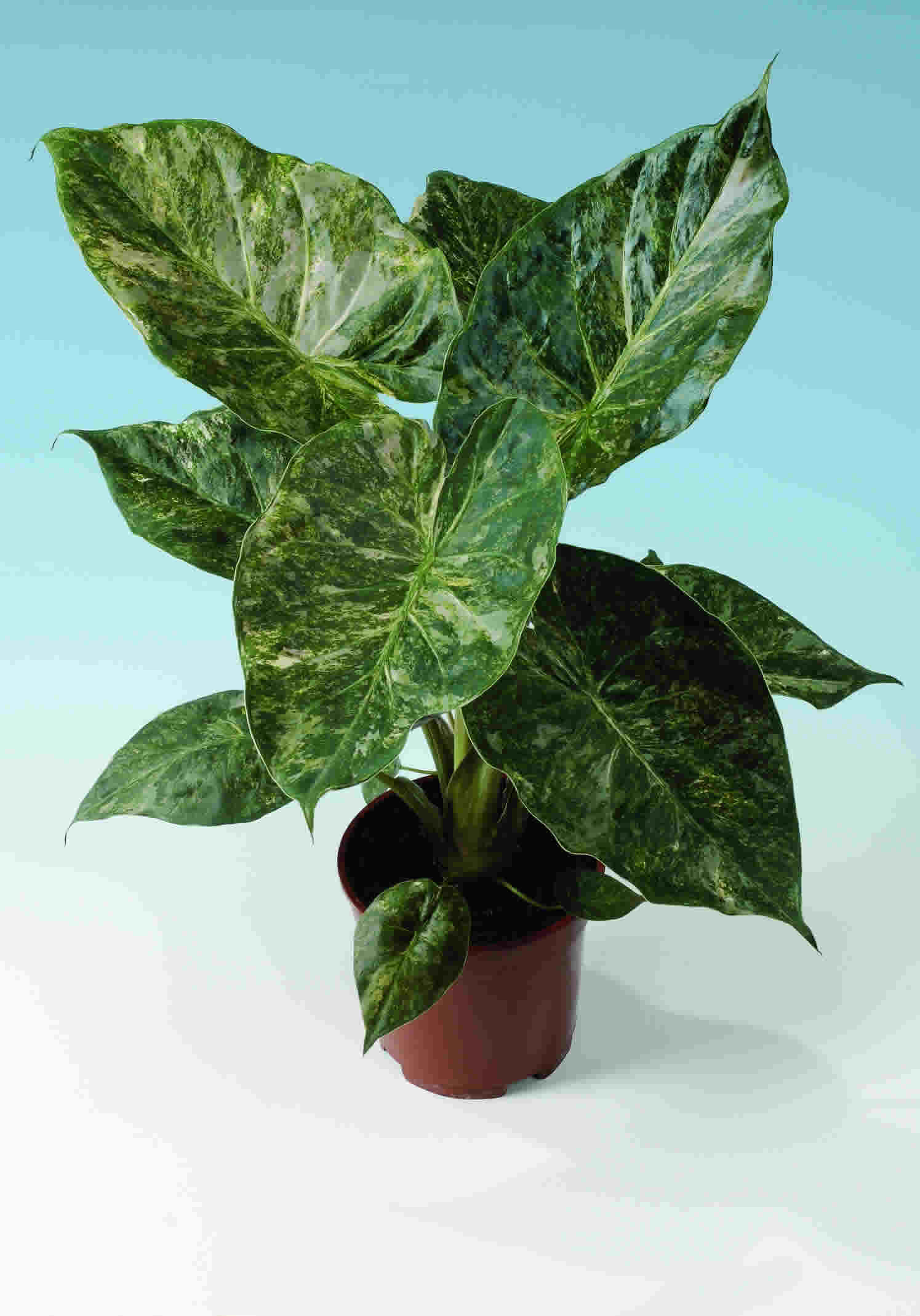 Deze ALOCASIA heeft een driekeurig blad in de kleuren groen, zilver en paars